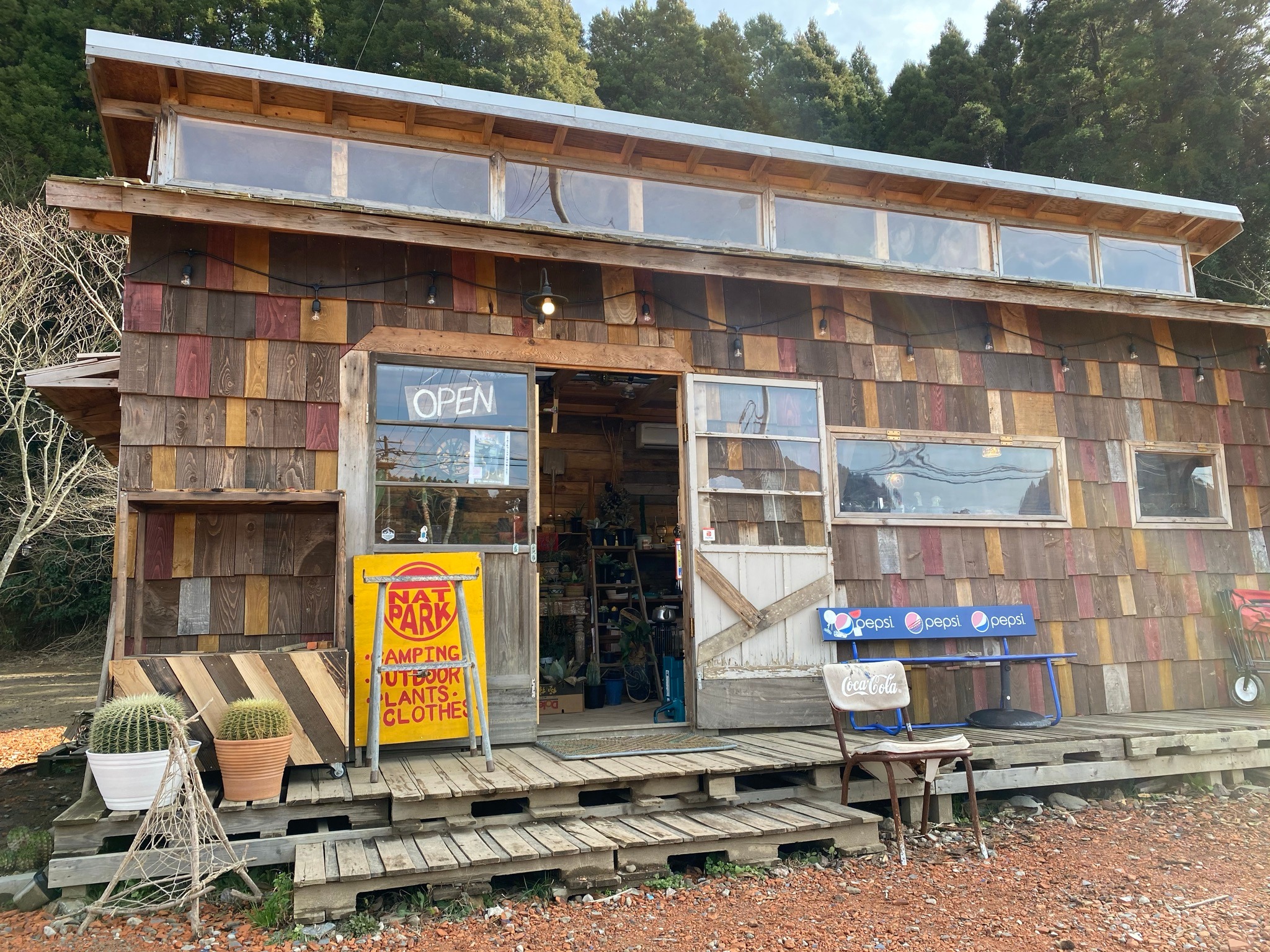 普段plushempを販売している店舗は千葉県いすみ市にあるキャンプ場。受付棟でplus hempは販売されています。NAT PARKは全て主人の手作り♪土地の開拓から建物の基礎から屋根まで。トイレもシャワーも。廃材など色々な所で使用してます。そんな主人も変わった植物が好きで販売、イベントなどをしているのでつい最近温室も手作りしてました!笑なんか面白い。人。次は温室も詳しく載せまーす♪