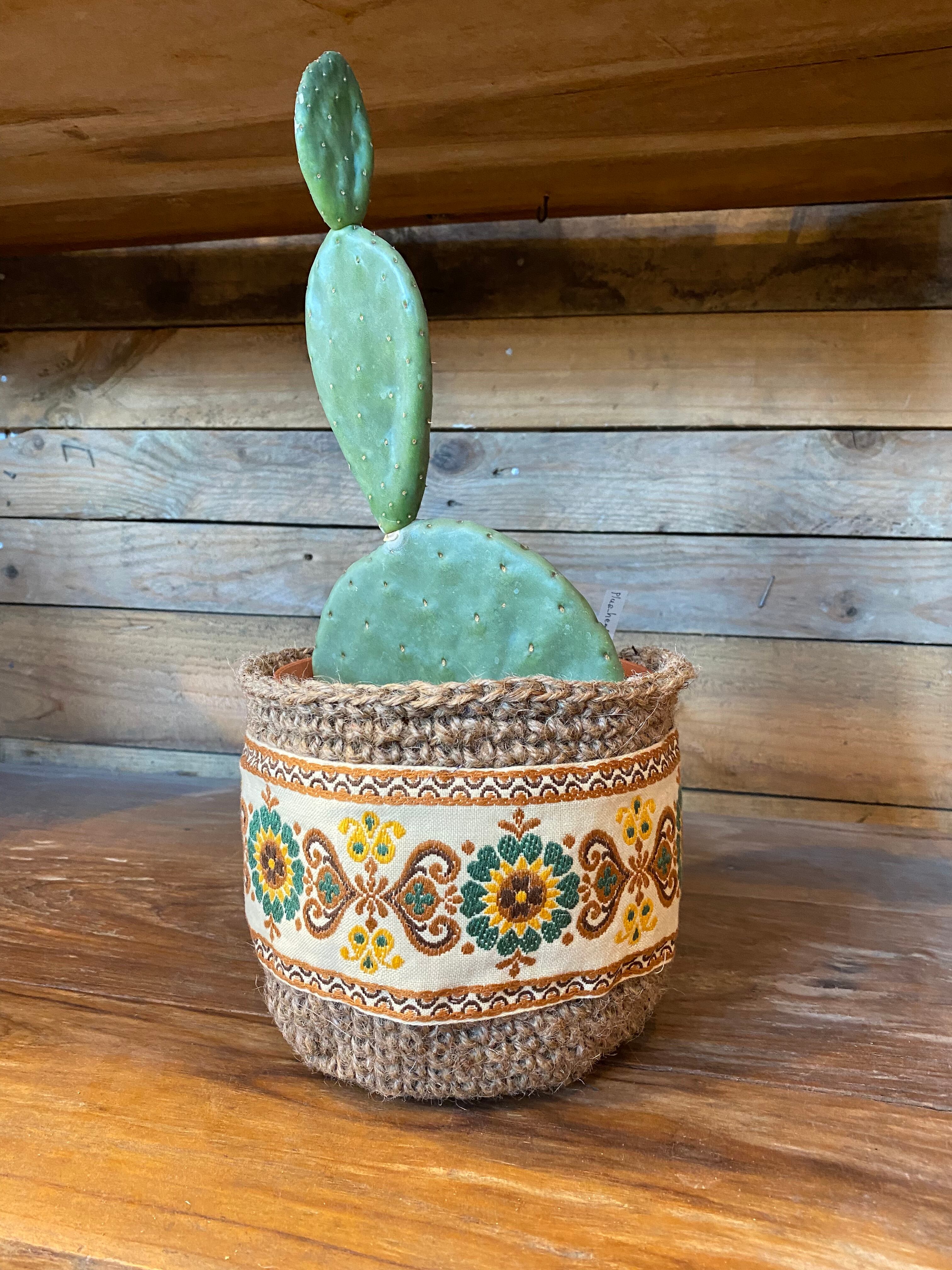 麻紐鉢カバーにドイツのビンテージチロリアンテープをつけました。レトロな雰囲気も◎