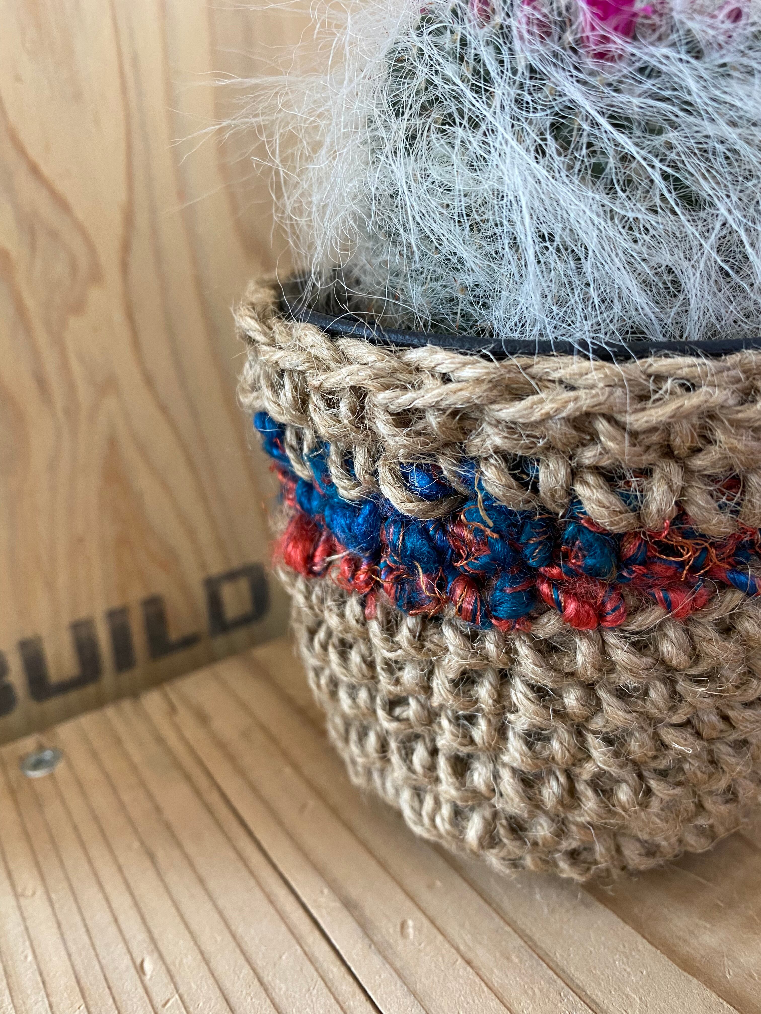 基本の麻紐鉢カバーにリサイクルシルクの糸を縫い合わせました。
