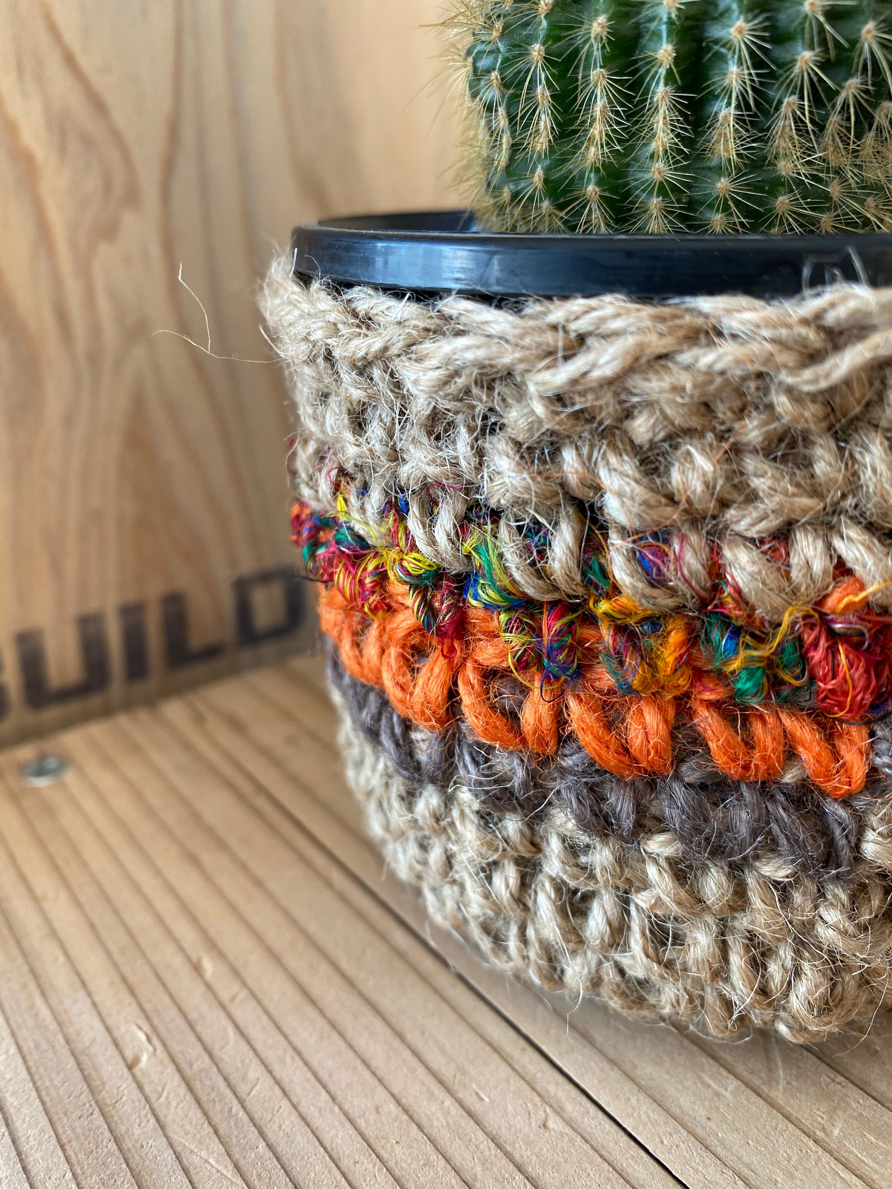 基本の麻紐鉢カバーにリサイクルシルク糸を使用し落ち着いたエスニック鉢カバーになりました。