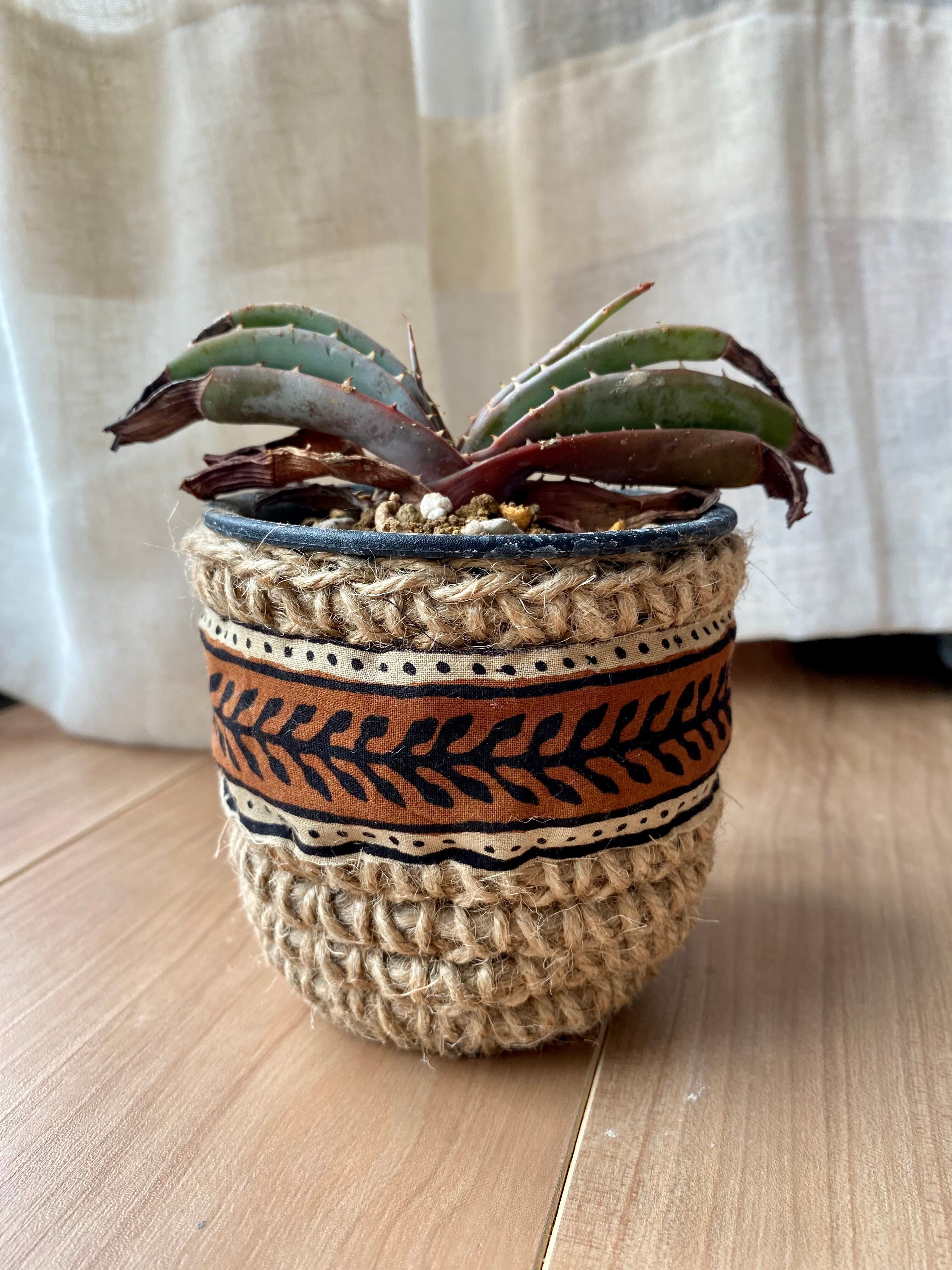 基本の麻紐にインドのブロックプリントを施した鉢カバーです。
