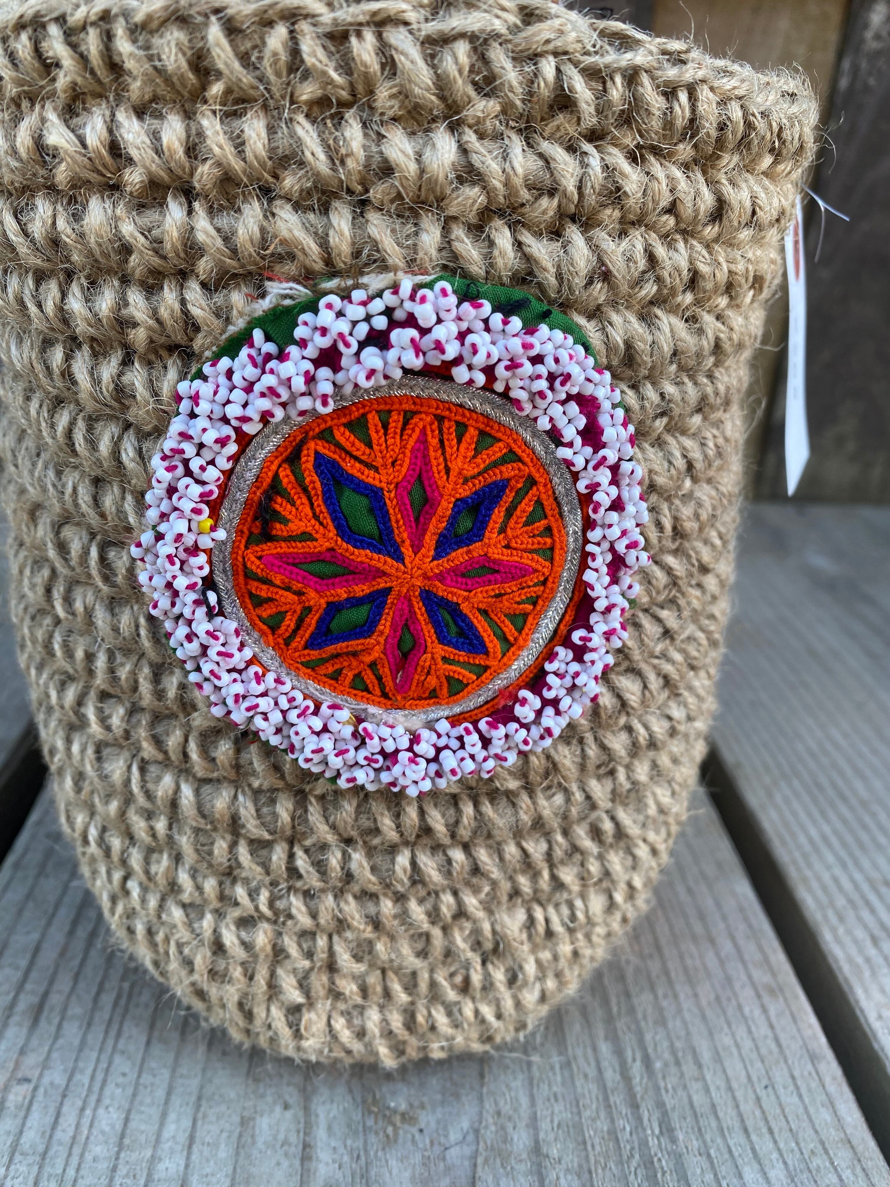 アフガニスタンのオールドワッペンを使用した麻紐鉢カバーできました。