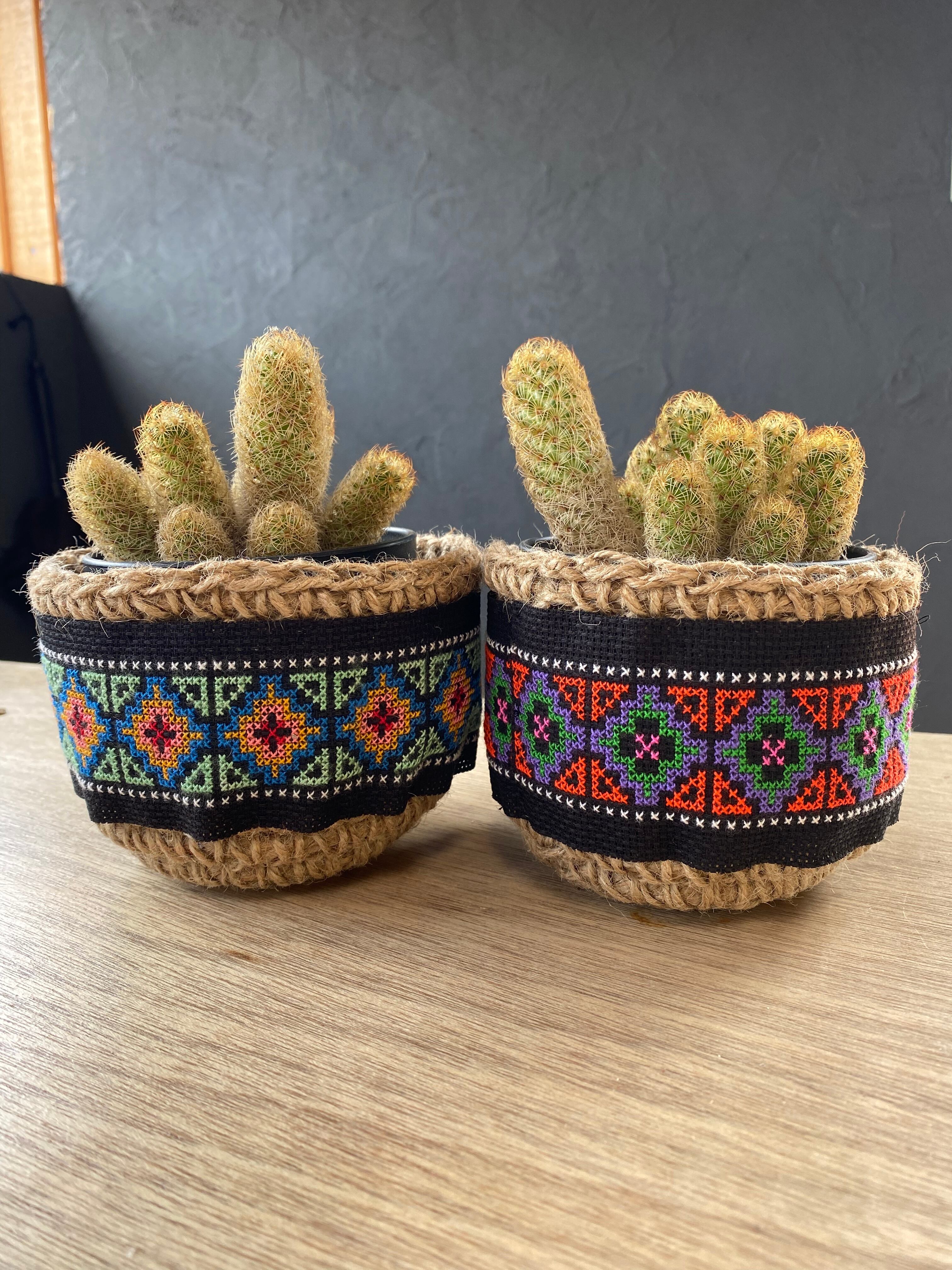 タイのチェンマイで仕入れたリボンで鉢カバー作りました。