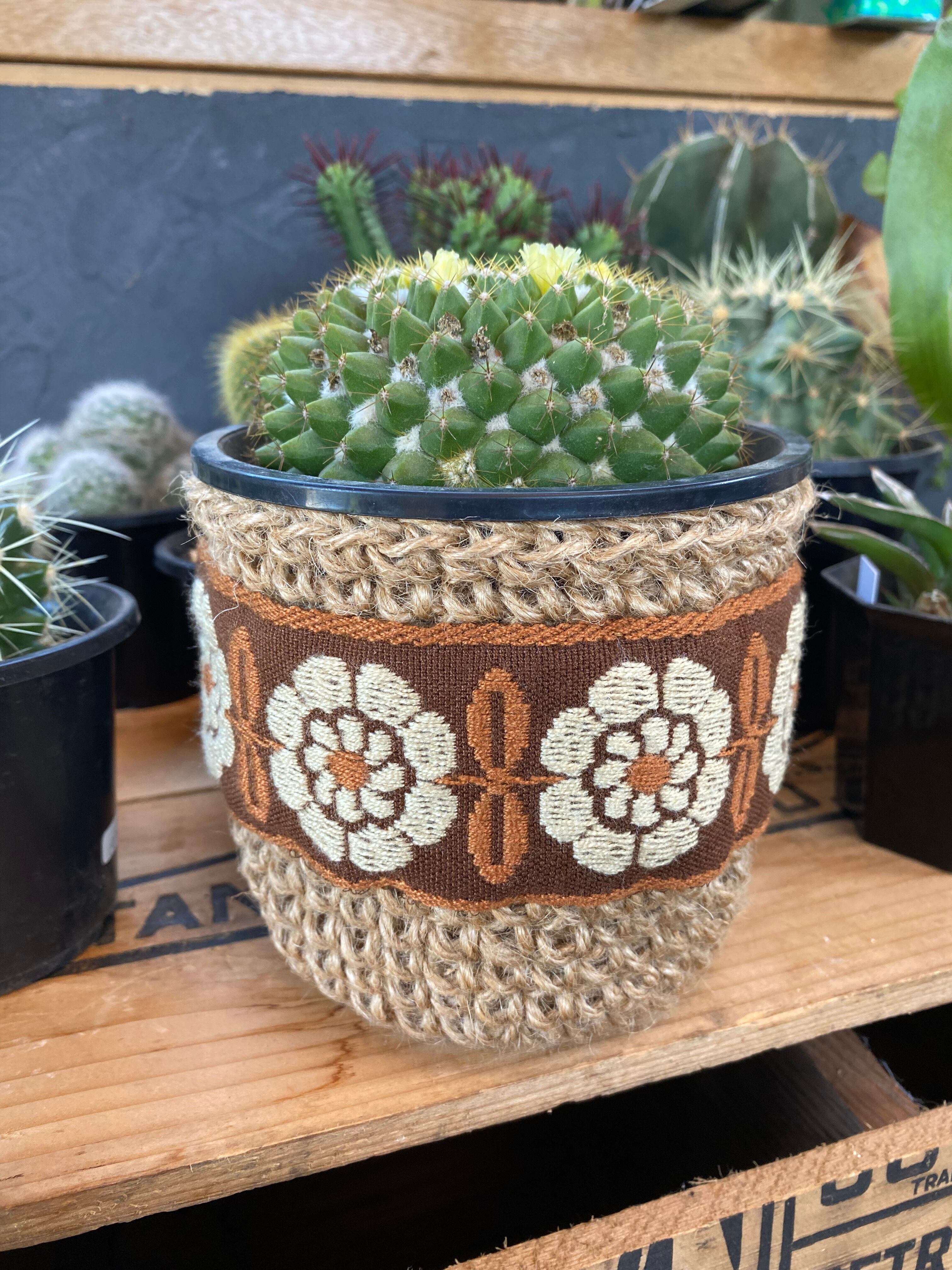 こちらの茶色のお花モチーフは特に人気の鉢カバーになります。肉厚でしっかりした作りはドイツリボンならでは。