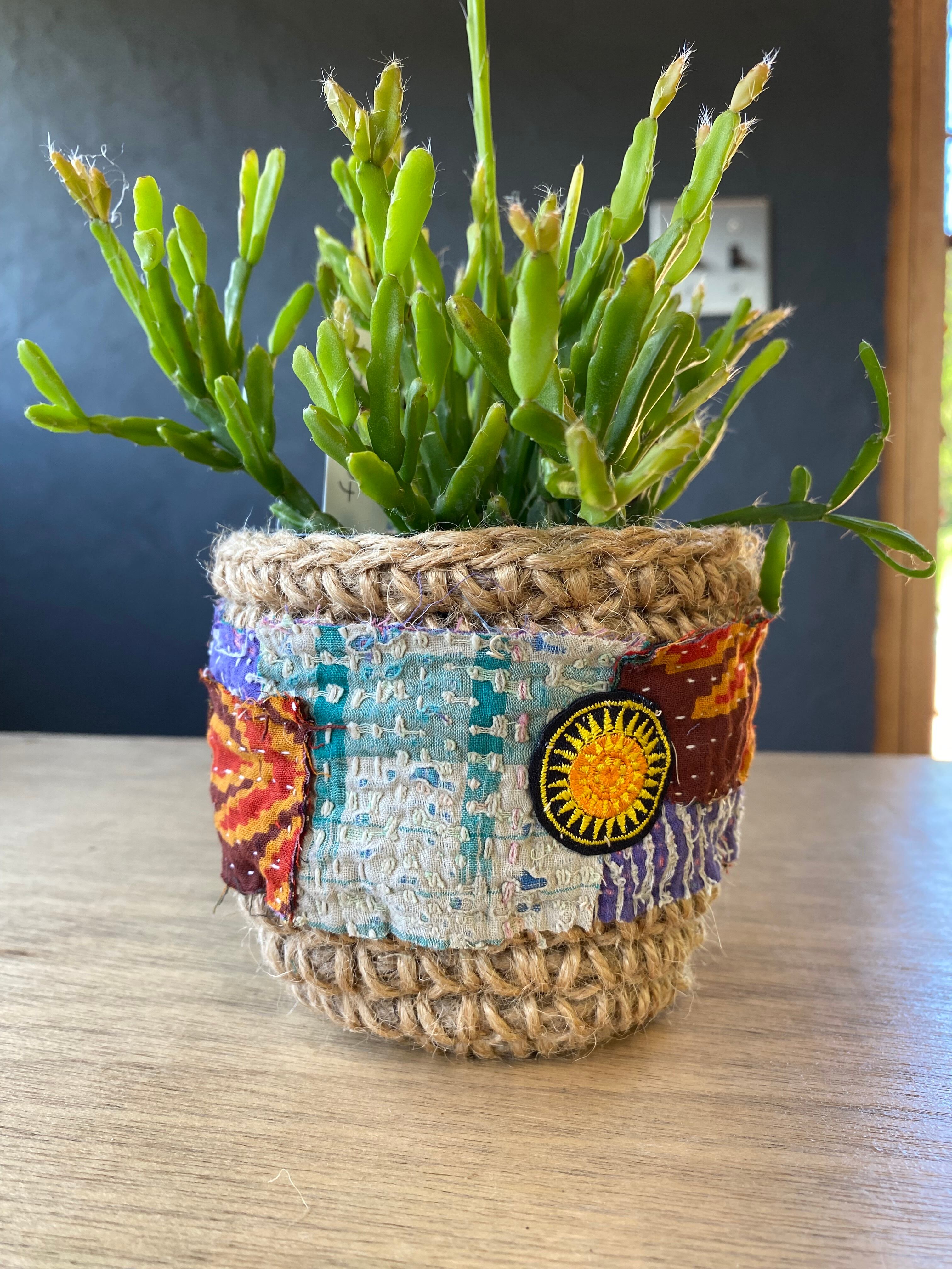 インド.ラリーキルトをパッチワークで仕上げ鉢カバーを作りました。。
