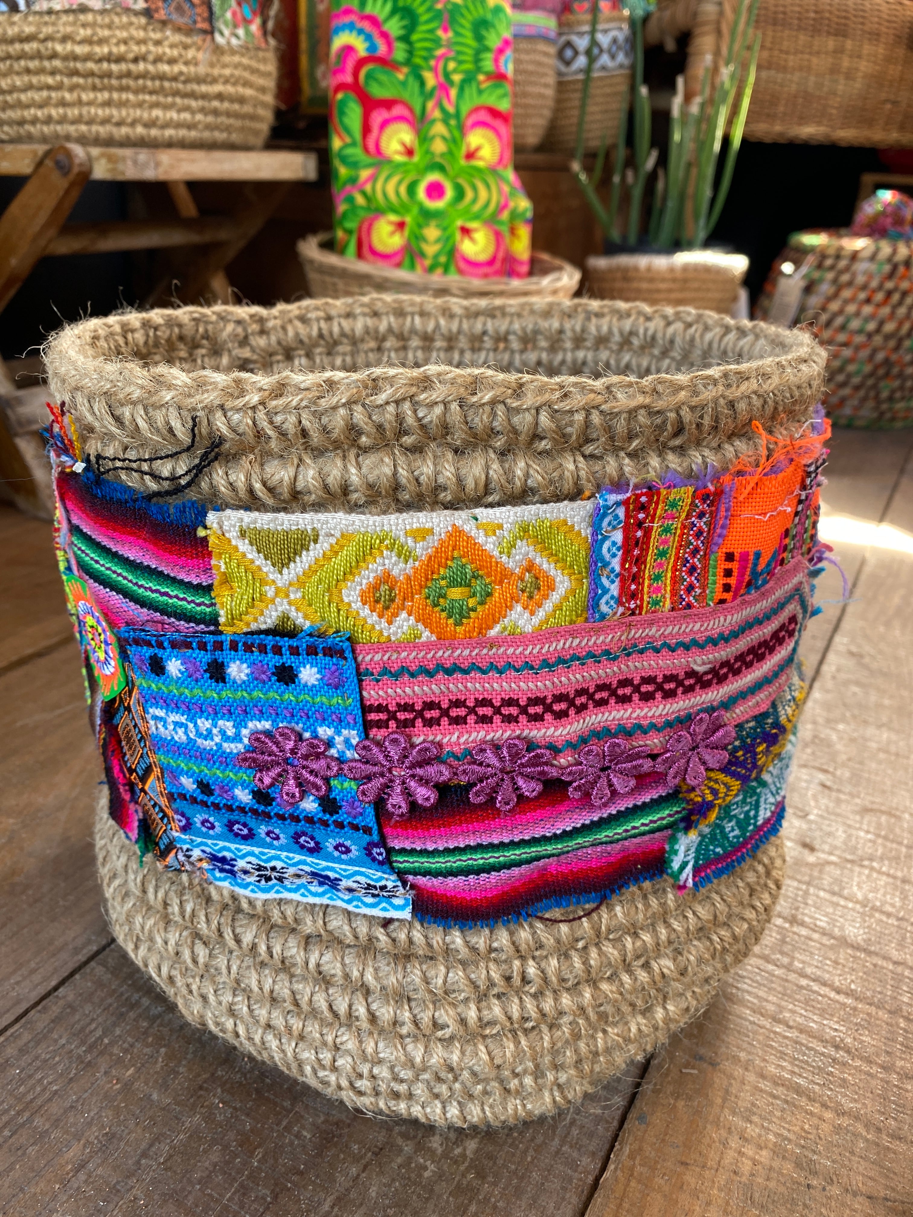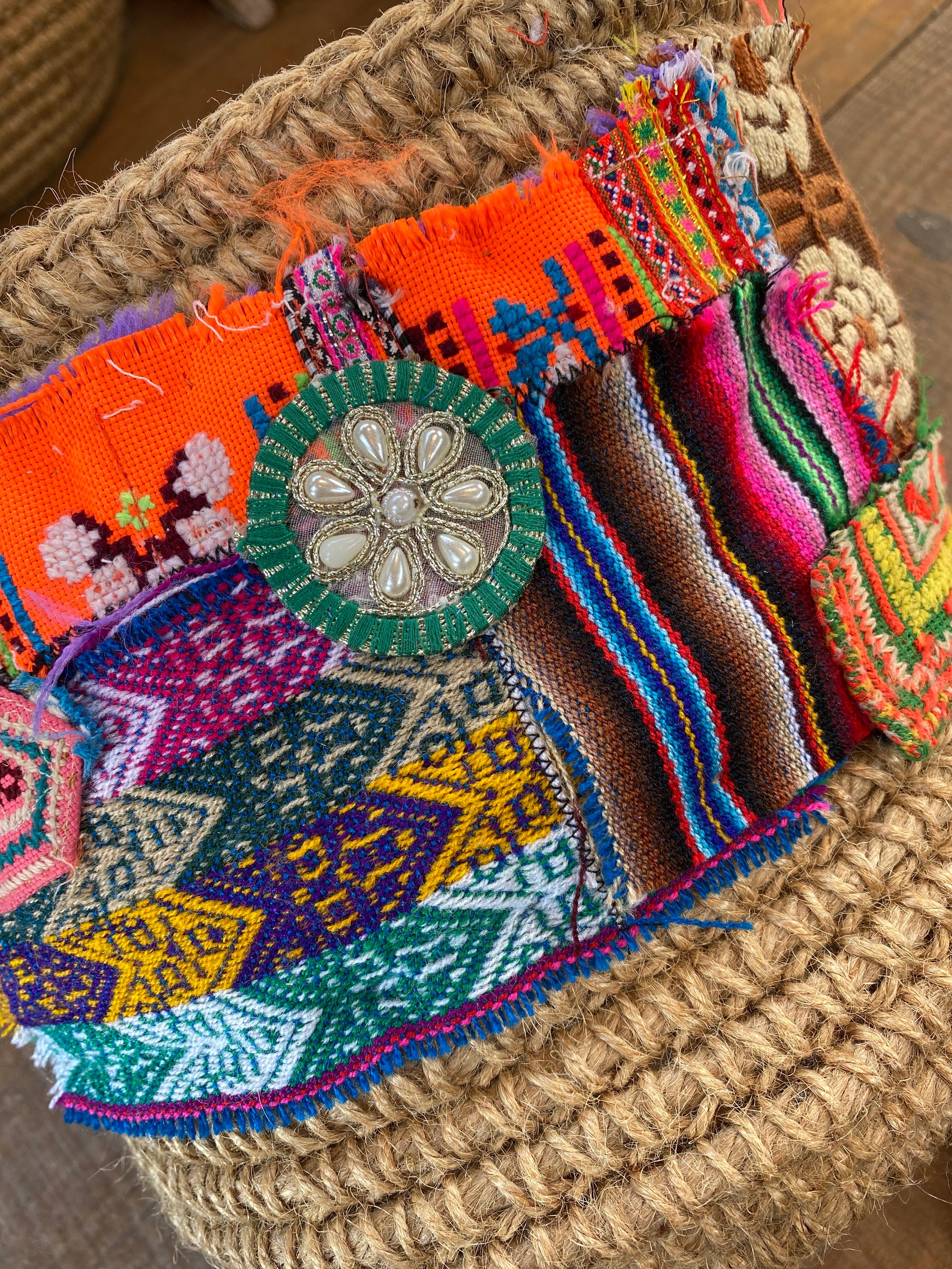 モン族古布、ビンテージリボンなどを沢山使ってパッチワークで仕上げました。