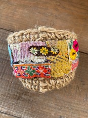 モン族の古布やラリーキルトを沢山使った鉢カバーです。